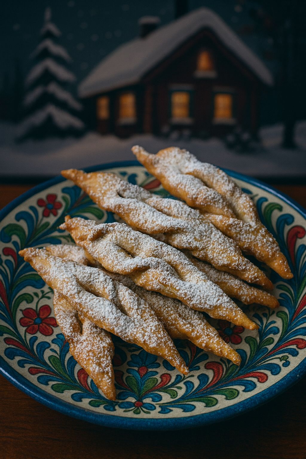 A deep saucepan or automatic deep-fryer will be needed. Sift together and set aside 5 cups sifted flour, 1 teaspoon cardamom. Beat until the mixture is thick and lemon-coloured: 10 egg yolks, 2 egg whites, ¾ cup sugar, 3 tablespoons brandy. Add slowly, stirring in 1 cup heavy cream. Blend in the flour mixture, about ½ cup at a time, to make a soft dough. Wrap the dough in waxed paper and chill overnight in the refrigerator. Set out a deep saucepan or automatic deep-fryer and heat to 365°F to 370°F lard. Meanwhile, roll the dough, a small portion at a time, to ⅛-inch thickness on a lightly floured surface. Cut into diamond shapes, 5×2 inches. (A pattern may be used as a guide around which to cut with a floured knife.) Make a lengthwise slit in the centre of the diamond and pull one tip end through it, tucking it back under itself. Deep-fry only as many cookies at one time as will float uncrowded one layer deep in fat. Deep-fry for 1 to 2 minutes, or until golden brown, turning once during deep-frying time. Drain over the fat for a few seconds before removing to absorbent paper. Sprinkle with confectioners’ sugar. Store in tightly covered containers.